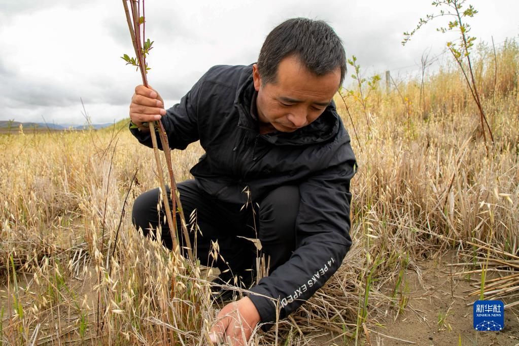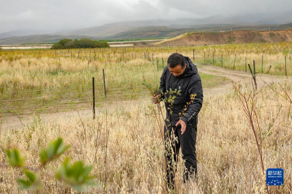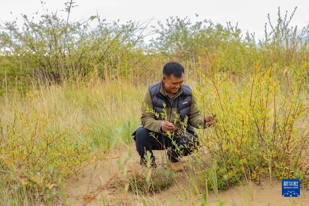 牧民卓玛加布在黄河玛曲段干流沿岸一处沙丘上查看他参与种植的灌木生长情况(9月16日摄)。 甘肃省甘南藏族自治州玛曲县地处青藏高原东部边缘,境内天然草原、沼泽湿地分布广,是黄河上游重要的水源涵养区、补给区。 受自然和人为因素的影响,上世纪八九十年代,玛曲草原出现不同程度沙化退化现象,水源涵养能力下降。 玛曲县通过实施退牧还草、沙化退化草原综合治理、湿地保护与修复、山水林田湖草沙一体化生态修复治理、草原鼠害防控等一系列生态保护工程项目,全力推动黄河上游生态保护和高质量发展。目前,玛曲县生态环境明显改善,玛曲草原向黄河补给水源的能力进一步提高。 新华社记者 郎兵兵 摄