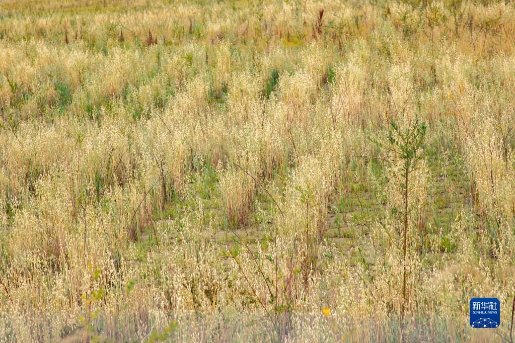 这是黄河玛曲段干流沿岸一处阻沙林带建设区域的草方格沙障内的植被(9月16日摄)。 甘肃省甘南藏族自治州玛曲县地处青藏高原东部边缘,境内天然草原、沼泽湿地分布广,是黄河上游重要的水源涵养区、补给区。 受自然和人为因素的影响,上世纪八九十年代,玛曲草原出现不同程度沙化退化现象,水源涵养能力下降。 玛曲县通过实施退牧还草、沙化退化草原综合治理、湿地保护与修复、山水林田湖草沙一体化生态修复治理、草原鼠害防控等一系列生态保护工程项目,全力推动黄河上游生态保护和高质量发展。目前,玛曲县生态环境明显改善,玛曲草原向黄河补给水源的能力进一步提高。 新华社记者 郎兵兵 摄